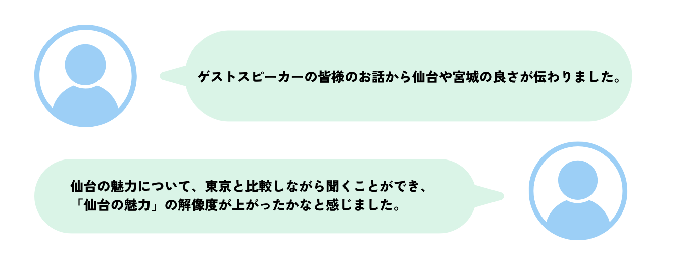 仙台で活躍するゲストスピーカーを迎え、リアルな体験と専門的知見から、様々なお話をしていただきました。